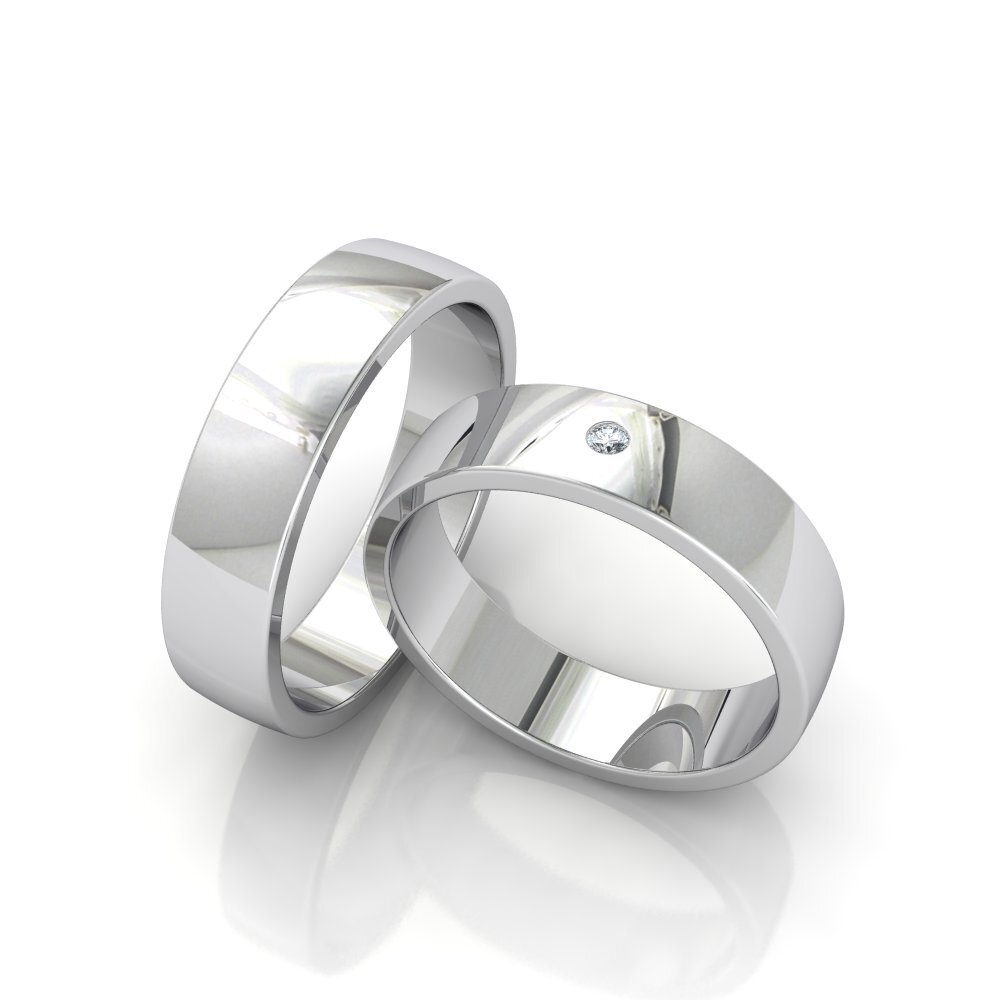 This is a configurable ring set. Both the width and the profile can be chosen. The set shown has the following specifications: Weight around 14 grams. 18K white gold. 18K yellow gold.0.18K rose gold. 950 Platinum. 0.02 carat diamond. G color. VS clarity. Excellent cut. Width 5mm, Height 1.45mm, Diamond 1.7mm diameter. Luxurious packaging included. We can make a free customized 3D drawing based on this design, the ring sizes and your wishes. Please contact us below. Also if you require advice from our experts.